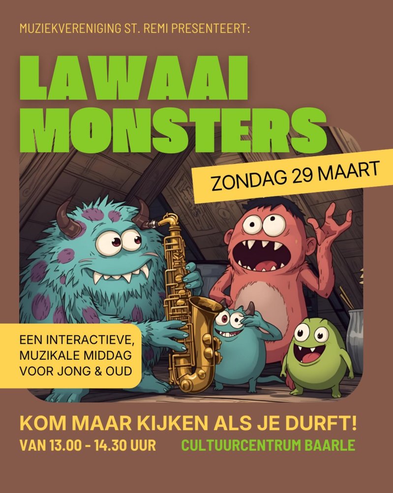 Zondag 29 maart laten onze Lawaaimonsters zich zien (en horen). En dat doen ze niet alleen, samen met alle afdelingen van muziekvereniging St Remi nemen ze je mee in een interactieve, muzikale middag. Kom maar kijken (en vooral ook meedoen) als je durft!